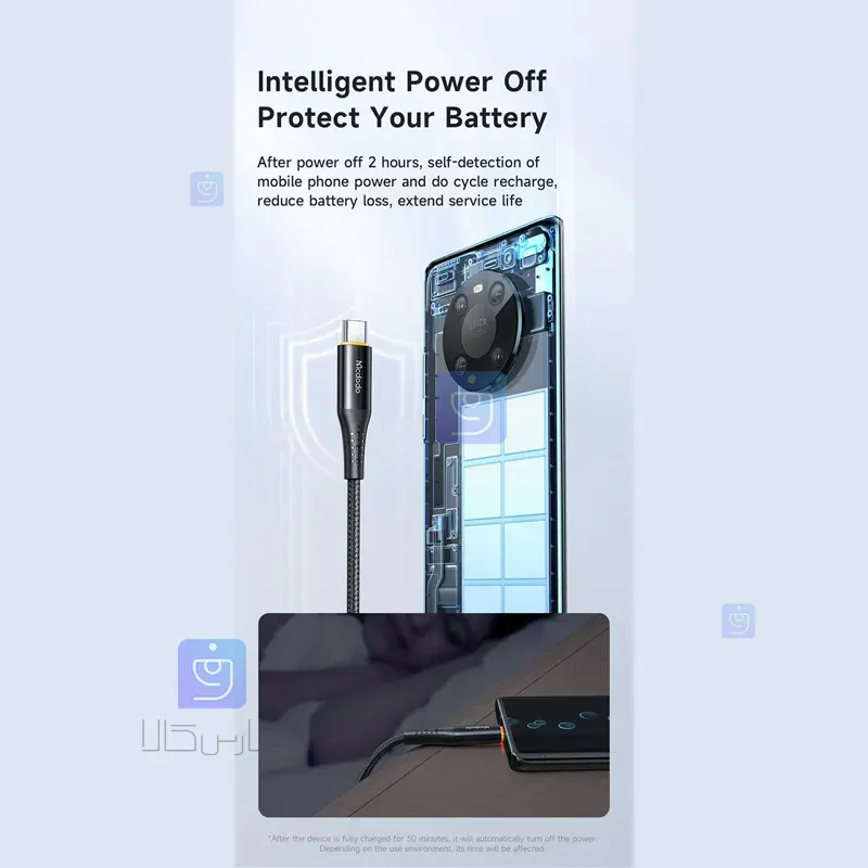 مجهز به سیستم قطع کن خودکار: مهم‌ترین ویژگی این کابل شارژ، داشتن سیستم قطع خودکار (Auto-Disconnect) است که پس از شارژ کامل دستگاه، جریان را قطع می‌کند تا از شارژ بیش‌ازحد و آسیب به باتری جلوگیری شود.