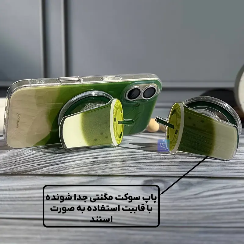 یکی از ویژگی های کاربردی و اصلی قاب ماچا پاپ سوکت آن میباشد که به صورت مگ سیف به بخش پشتی قاب متصل میشود تا بتوانید در مواقعی که به آن نیاز ندارید آن را جدا کنید، همچنین میتوانید با استفاده از این بخش گوشی را به صورت استند قرار دهید و بدون نیاز به دست گرفتن آن به انجام امور روز مره خود بپردازید .
