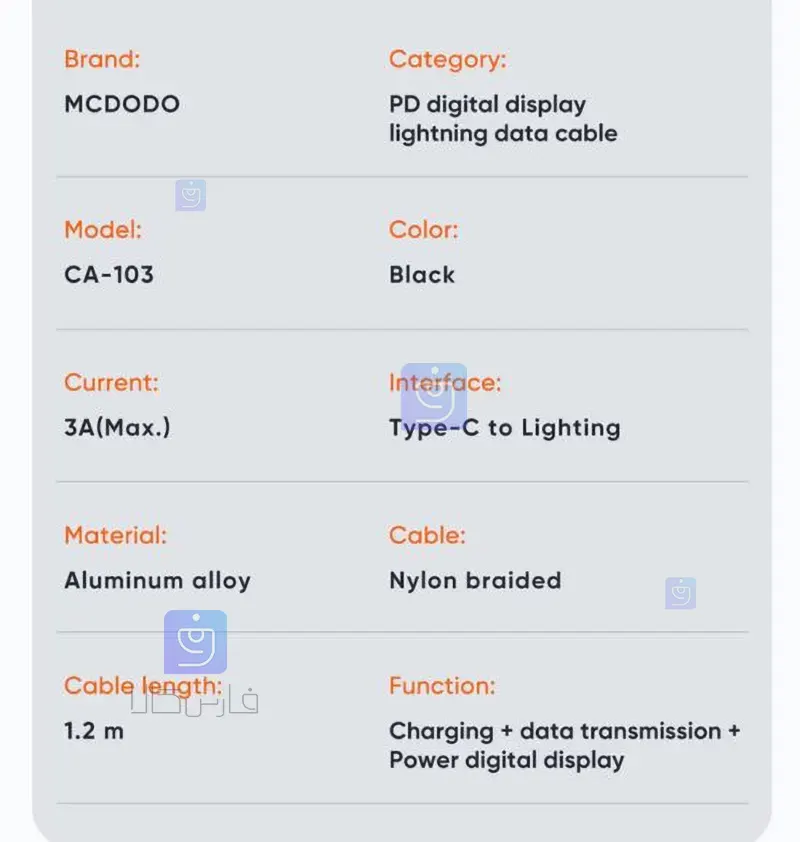 شارژ سریع 36 واتی با تکنولوژی PD: این کابل شارژ از قابلیت شارژ 36 وات و فناوری شارژ سریع PD پشتیبانی می کند و امکان شارژ سریع گوشیهای آیفون 8 به بعد را فراهم می کند.