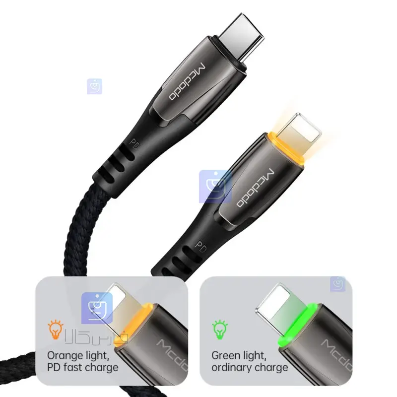 نشانگر LED هوشمند با دو رنگ: کابل دارای نشانگر LED در دو رنگ است که نور سبز عملیات شارژ با سرعت استاندارد و نور نارنجی شارژ سریع با فناوری PD را نشان می دهد.