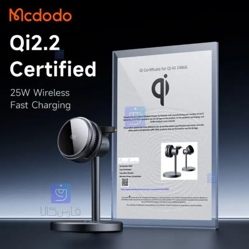 پشتیبانی از تکنولوژی شارژ سریع Qi2.2 با توان 25 وات: این شارژر از جدیدترین سیستم استاندارد شارژ وایرلس Qi2.2 با توان شارژ 25 واتی پشتیبانی می کند، و قادر به شارژ بیسیم گوشیهای سازگار را با توانهای 5W / 7.5W / 10W / 15W / 25W است