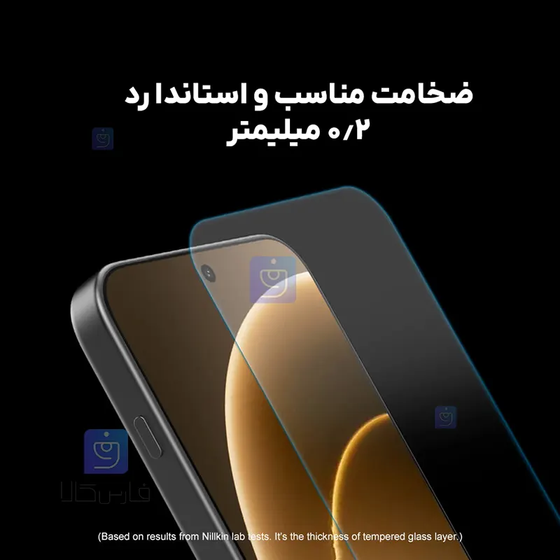 ضخامتی که برای این گلس نیلکین در نظر گرفته شده است حدود 0.2 میلیمتر می باشد که نسبت به محافظ های دیگر از ضخامت مناسبی برخوردار است البته ضخامت کم این محافظ دلیل بر ضعف آن در برابر ضربه نمی باشد زیرا برند نیلکین در ساخت این محصول از چند لایه محافظتی مختلف استفاده کرده است که هر کدام ویژگی و عملکرد خاص خود را دارند تا در کنار ضخامت استاندارد بالاترین عملکرد دفاعی را نیز از این محافظ شاهد باشیم .