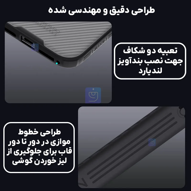 برند نیلکین که یکی از قوی ترین تولید کننده های لوازم جانبی موبایل میباشد در طراحی قاب ضد ضربه کمشیلد پرو کلیر نیز مانند سایر محصولات خود کاملا مهندسی شده عمل کرده و قسمت پورت ها و رابط های کاربری را با استفاده از شیار های مناسب توسط دستگاه های CNC با بالاترین دقت برش داده است تا کاربر هنگام استفاده از قاب دچار محدودیت نشود همچنین در بخش فریم قاب از خطوط موازی استفاده شده است تا با ایجاد اصطکاک از لیز خوردن گوشی جلوگیری شود .