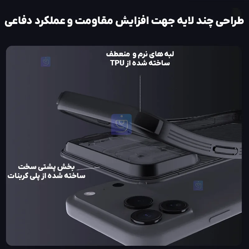 این محصول به صورت چند لایه ساخته شده است به این صورت که در ساخت بخش فریم آن از مواد نرم و منعطف TPU و در ساخت قسمت پشتی آن از مواد پلی کربنات سخت PC استفاده شده است که علاوه بر افزایش دوام و مقاومت قاب عملکرد دفاعی آن را نیز افزایش داده است .