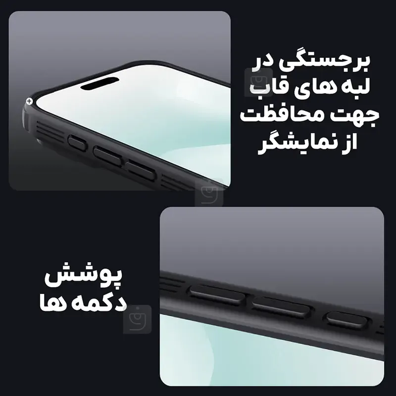 هنگام افتادن گوشی از دست چهار گوشه قاب بیشترین احتمال برخورد با سطح و آسیب دیدگی را دارند به همین دلیل در ساخت قاب نیلکین کمشیلد پرو آیفون 17 پرو چهار گوشه قاب نسبت به سایر بخش های آن تقویت شده و ضخامت بیشتری دارند تا این محصول در برابر ضربات سنگین، عملکرد دفاعی بالایی از خود نشان دهد و از ورود آسیب های جدی به گوشی جلوگیری کند.