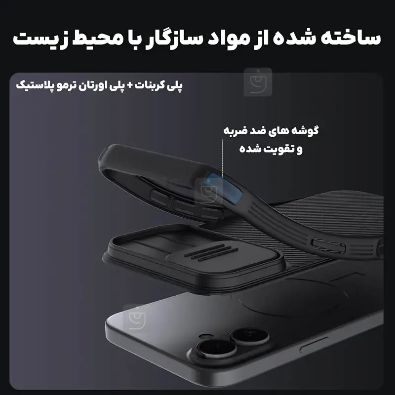 هنگام افتادن گوشی از دست چهار گوشه قاب بیشترین احتمال برخورد با سطح و آسیب دیدگی را دارند به همین دلیل در ساخت قاب نیلکین کمشیلد پرو آیفون 17 چهار گوشه قاب نسبت به سایر بخش های آن تقویت شده و ضخامت بیشتری دارند تا این محصول در برابر ضربات سنگین، عملکرد دفاعی بالایی از خود نشان دهد و از ورود آسیب های جدی به گوشی جلوگیری کند.