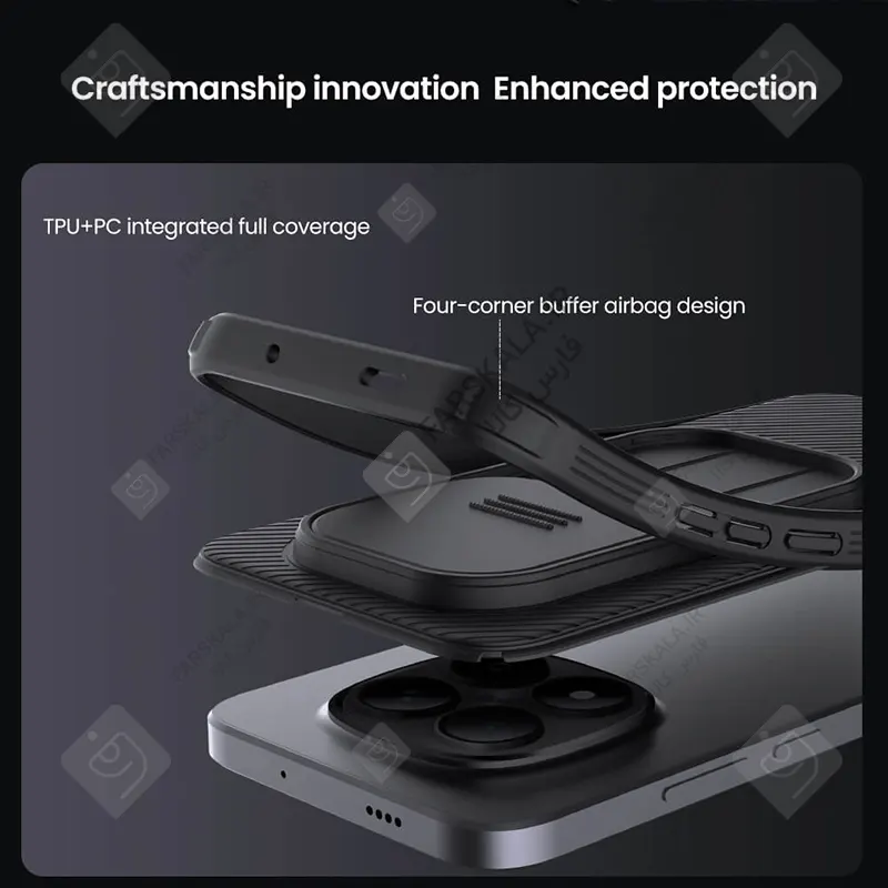 هنگام افتادن گوشی از دست چهار گوشه قاب بیشترین احتمال برخورد با سطح و آسیب دیدگی را دارند به همین دلیل در ساخت قاب نیلکین کمشیلد پرو شیائومی نوت 15 پرو پلاس چهار گوشه قاب نسبت به سایر بخش های آن تقویت شده و ضخامت بیشتری دارند تا این محصول در برابر ضربات سنگین، عملکرد دفاعی بالایی از خود نشان دهد و از ورود آسیب های جدی به گوشی جلوگیری کند.