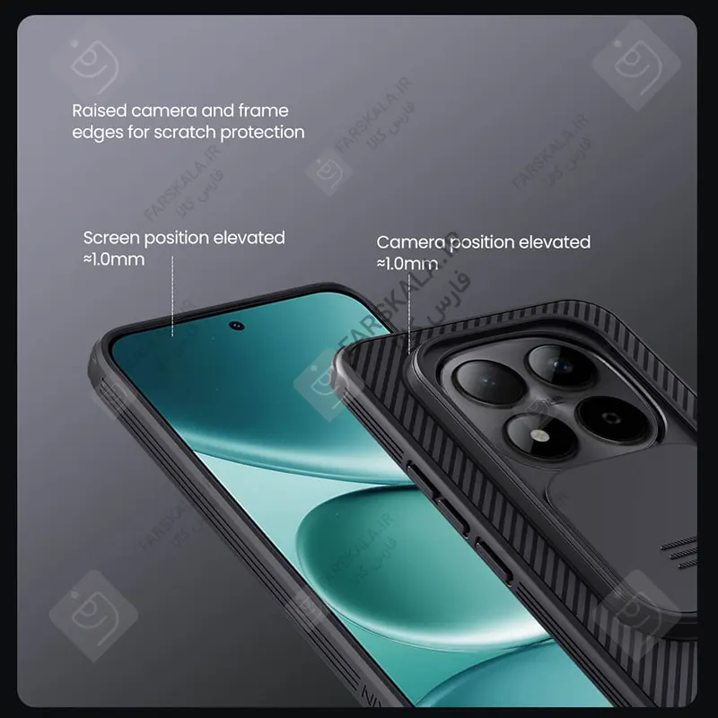 قاب نیلکین CamShield Pro گوشی شیائومی Poco M8 Pro 5G از مواد سخت پلی کربنات ( پشت قاب ) و سیلیکون نرم در بخش بامپر ( دور تا دور قاب ) ساخته شده است که از پشت، لبه ها و حتی از دوربین پشتی گوشی به طور کامل محافظت می کند و استحکام عالی روی بدنه دارد . ضخامت استاندارد این محصول سبب شده است تا نسبت به سایر قاب های ضد ضربه کمترین تغییر را در سایز و ابعاد گوشی به وجود بیاورد همچنین در لبه های قاب از خطوط موازی و برجسته استفاده شده است که کمک می کند قاب به راحتی در دست قرار گیرد و از لیز خوردن گوشی جلوگیری شود .