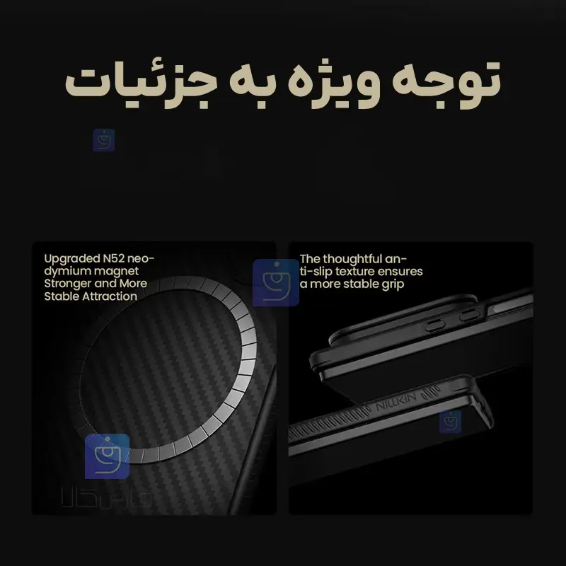 برند نیلکین این قاب را فقط با ضخامت 8 میلیمتر تولید کرده و در داخل آن از آهنرباهای قوی N52 استفاده کرده است تا در مواقع لازم بتوانید بدون نیاز به جدا کردن قاب از گوشی آن را به صورت مگ سیف یا بی سیم شارژ کنید همچنین این آهن ربا ها به شما کمک می کنند تا گوشی را به راحتی بدون نیاز به اضافه کردن قطعه فلزی جداگانه به هولدر های مگنتی یا پاور بانک های مگنتی متصل کنید.