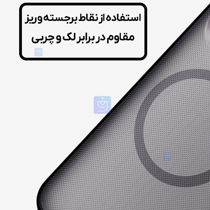 سطح قاب گوشی آیفون 17 مدل Super Frosted Shield Pro Clear case به صورت مات با استفاده از نقاط ریز و برحسته طراحی شده است، این نقاط علاوه بر زیبایی قاب باعث می شوند هنگام کار با گوشی هیچگونه لک و چربی روی سطح قاب جذب نشود و از ظاهر شدن اثر انگشت روی آن جلوگیری می کند همچنین سبب ایجاد اصطکاک بین دست و قاب می شوند تا از لیز خوردن گوشی جلو گیری شود .