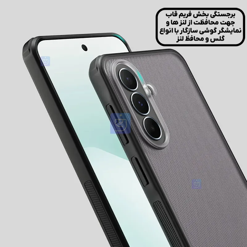سطح قاب گوشی A37 مدل Super Frosted Shield Pro Clear case به صورت مات با استفاده از نقاط ریز و برحسته طراحی شده است، این نقاط علاوه بر زیبایی قاب باعث می شوند هنگام کار با گوشی هیچگونه لک و چربی روی سطح قاب جذب نشود و از ظاهر شدن اثر انگشت روی آن جلوگیری می کند همچنین سبب ایجاد اصطکاک بین دست و قاب می شوند تا از لیز خوردن گوشی جلو گیری شود .