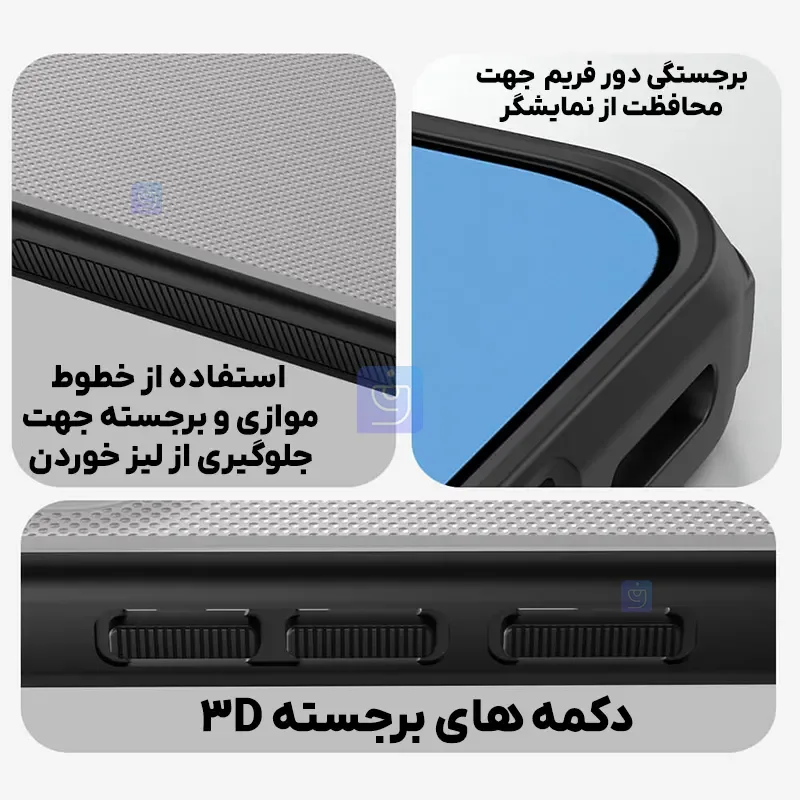 قسمت لنز این محصول نسبت به سایر بخش های قاب برجستگی دارد که این امر سبب می شود تا با قرار گرفتن گوشی روی سطوح صاف دوربین پشتی گوشی تماس کمتری با سطح داشته باشد و یا هنگام افتادن گوشی از دست احتمال برخورد لنز های گوشی با زمین کاهش پیدا کند از این رو تا حد زیادی از ضربه دیدن و خط و خش برداشتن لنز ها جلوگیری می شود همچنین به دلیل طراحی استاندارد این بخش میتوانید همزمان با استفاده از این محصول از انواع محافظ لنز بدون کوچکترین تداخلی استفاده کنید .