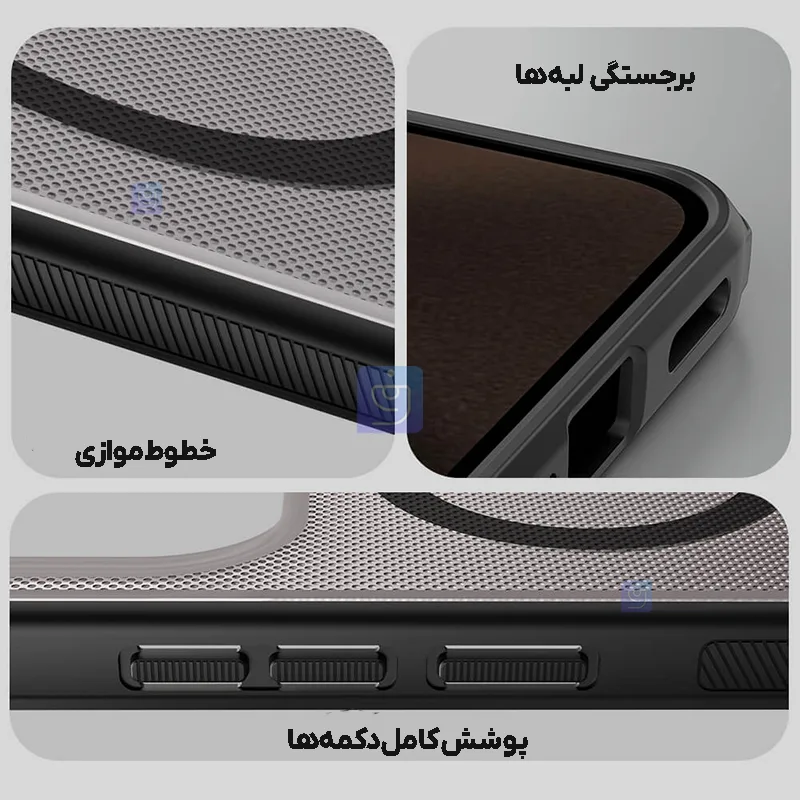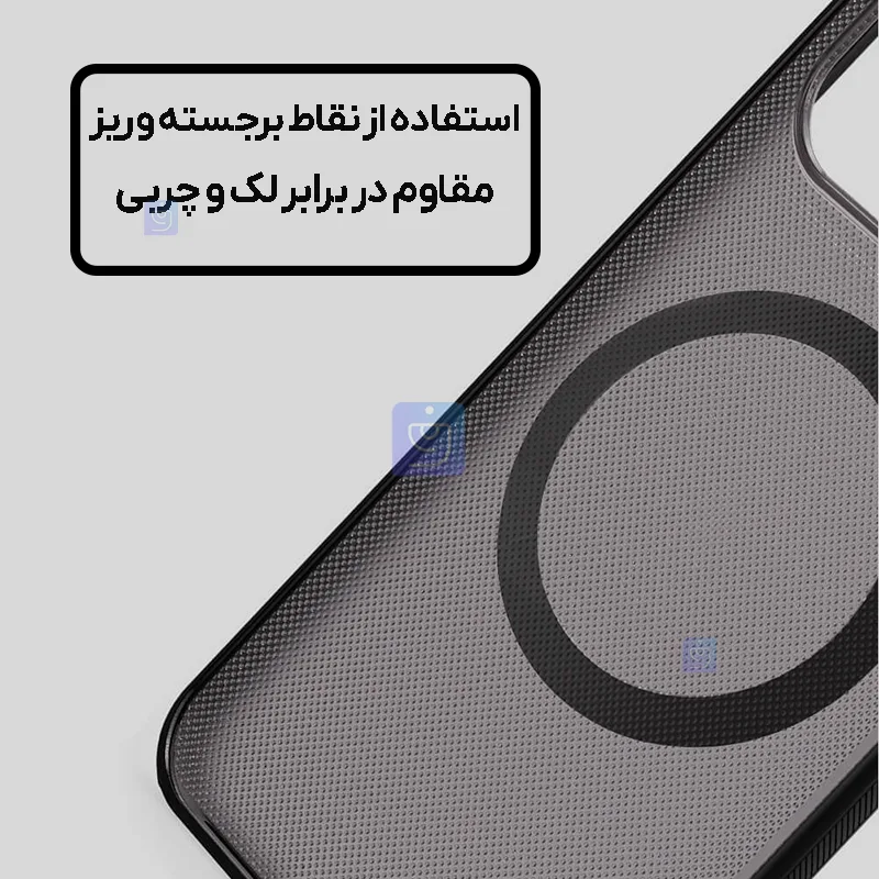 درون قاب از آهن ربا های به هم پیوسته دایره ای شکل استفاده شده که به کاربر امکان شارژ به صورت بی سیم را می دهد، به این صورت که برای شارژ بی سیم دیگر نیاز به جدا کردن قاب از گوشی نیست و همزمان با استفاده از قاب می توانید به صورت مگ سیف گوشی را شارژ کنید همچنین با این قاب بدون نیاز به اضافه کردن قطعه فلزی جداگانه می توانید گوشی خود را به هولدر های مگنتی متصل کنید .