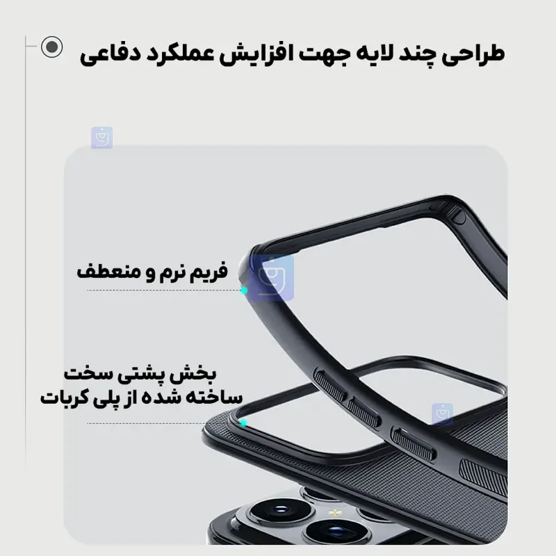 قسمت لنز این محصول نسبت به سایر بخش های قاب برجستگی دارد که این امر سبب می شود تا با قرار گرفتن گوشی روی سطوح صاف دوربین پشتی گوشی تماس کمتری با سطح داشته باشد و یا هنگام افتادن گوشی از دست احتمال برخورد لنز های گوشی با زمین کاهش پیدا کند از این رو تا حد زیادی از ضربه دیدن و خط و خش برداشتن لنز ها جلوگیری می شود همچنین به دلیل طراحی استاندارد این بخش میتوانید همزمان با استفاده از این محصول از انواع محافظ لنز بدون کوچکترین تداخلی استفاده کنید .