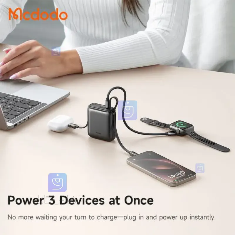 سه خروجی کاربردی با کابلهای متصل: این پاوربانک به سه خروجی شامل یک پورت تایپ سی 22.5 وات، کابل متصل تایپ سی 22.5 وات و کابل متصل لایتنینگ 12 وات مجهز است که شما را از حمل کابل اضافه بینیاز میکند و امکان شارژ همزمان 3 دستگاه را بهراحتی فراهم میسازد.