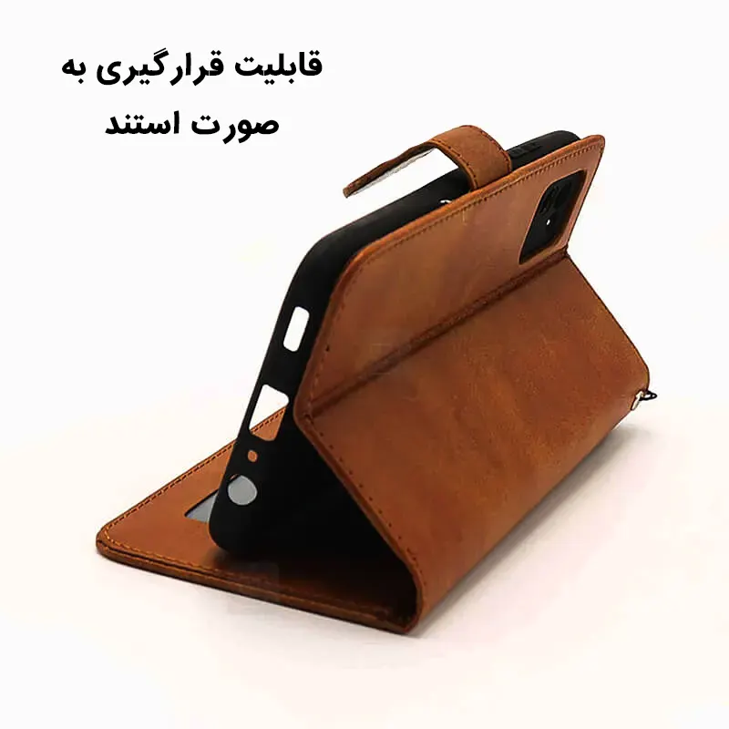 یکی دیگر از ویژگی های کاربردی کیف کلاسوری بند دار RFID گوشی شیائومی پوکو C55 قابلیت استفاده به صورت استند میباشد برای قرار دادن کیف به حالت استند کافیست درب کیف را باز کنید سپس با قرار دادن درب در پشت کیف مانند تصویر می توانید گوشی را به حالت استند قرار دهید تا بدون نیاز به نگه داشتن گوشی در دست خود از تماشای فیلم و انجام امور روز مره لذت ببرید لازم به ذکر است که در این حالت زاویه کیف به گونه ای طراحی شده تا هنگام کار با گوشی بهترین زاویه دید را در اختیار شما قرار دهد تا وضوح و شفافیت صفحه نمایش حفظ شود .