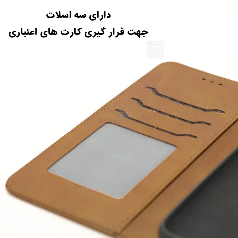 بر روی درب کیف گوشی شیائومی پوکو C55 مدل RFID leather flip سه شکاف مجزا جهت قرار دادن کارت های اعتباری ایجاد شده است تا در مواقع نیاز به سرعت به کارت بانکی پر استفاده خود دسترسی داشته باشید همچنین برای جلوگیری از باز شدن بی مورد درب کیف بر روی آن کمربندی مگنتی تعبیه شده است تا هنگام افتادن گوشی از دست از وارد شدن ضربه به LCD گوشی جلوگیری شود .